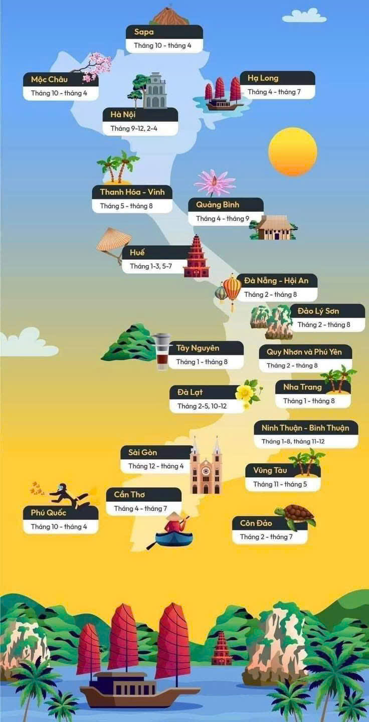 South: Dry season from November to April is perfect for Ho Chi Minh City and the Mekong Delta.