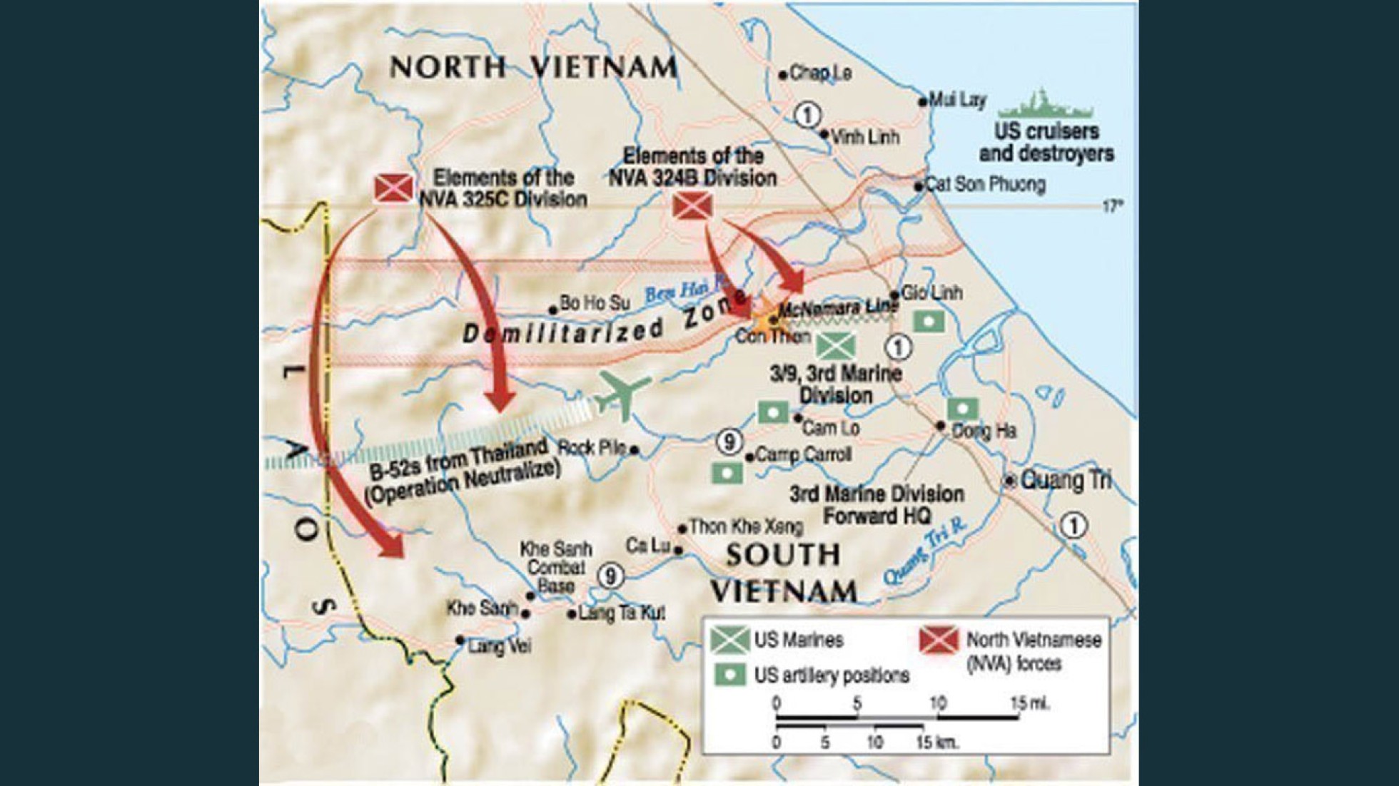 In the lead up to the 1968 Tet Offensive, as part of the diversionary attacks, the base became the target of prolonged shelling, followed by an infantry assault, during which it was briefly surrounded by the NVA. More than 40,000 tonnes of bombs were dropped around Con Thien, transforming the hills into a smoking moonscape.